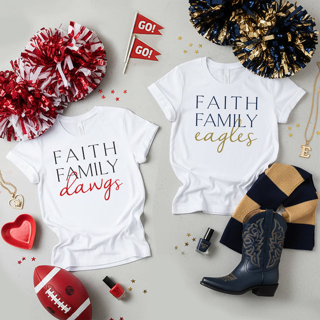 Our newest Faith & Family tees were designed for women who cheer with heart — who balance church pews and bleachers, prayer and team spirit.